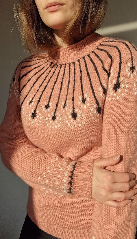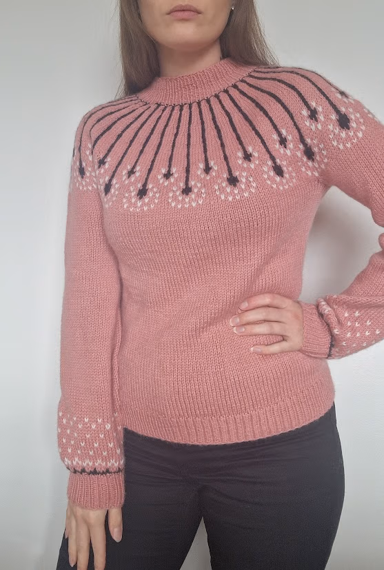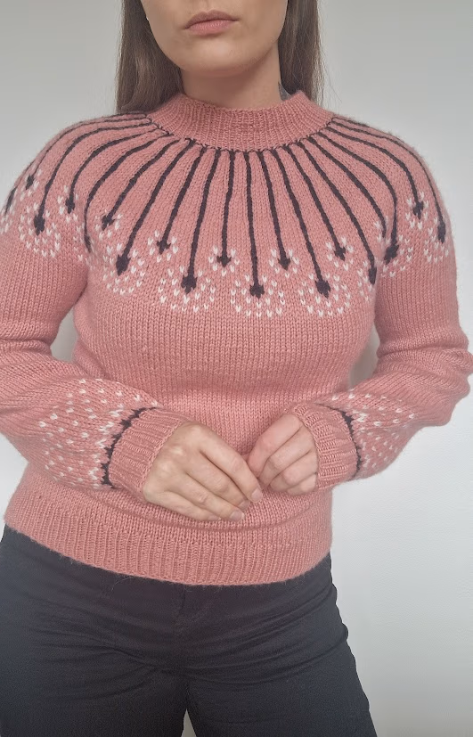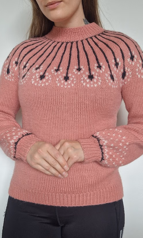 Peysan er prjónuð neðan frá og upp, en fyrir þá sem eru vanir að prjóna frá hálsmáli, þá er auðvelt að fylgja uppskriftinni öfuga leið, og taka saman þar sem stendur auka út.
