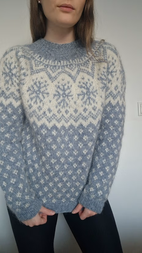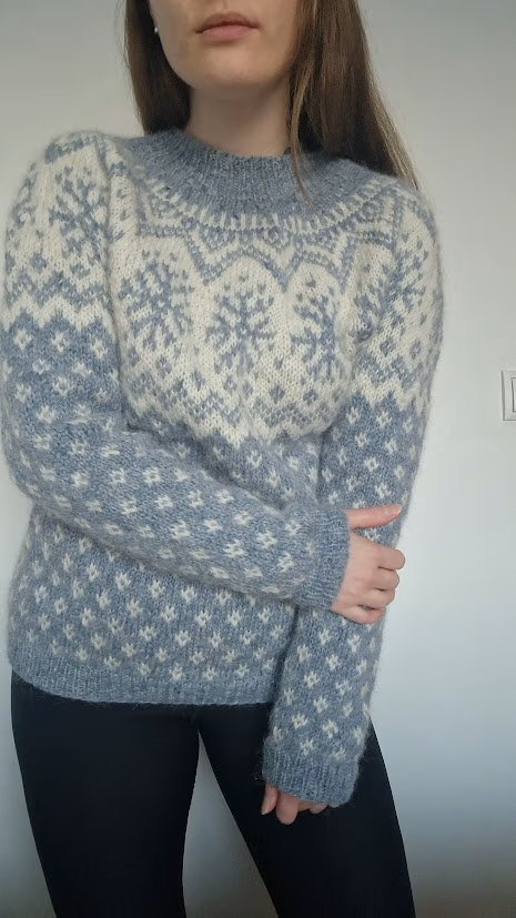 Ef ég nenni uppskrift er prjónuð neðan frá og upp, en fyrir þá sem eru vanir að prjóna frá hálsmáli, þá er auðvelt að fylgja uppskriftinni öfuga leið, og taka saman þar sem stendur auka út.